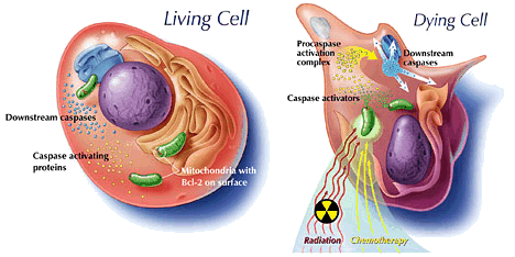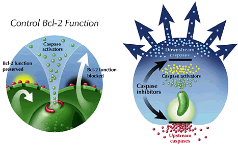 The caspases are a family of proteases responsible for carrying out the cell death process. In a living cell, these proteases are kept inactive by proteins on the mitochondrial cell surface from the BcL-2 family. When a cell is exposed to cell death signals such as ischemia, chemotherapy or radiation, BcL-2 function is blocked and caspase activators initiate the cell death cascade.